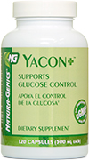 El yacón es una planta nativa de la región andina especialmente del Perú rica en polifenoles y compuestos bioactivos. En el Perú, yacón se cultiva debido a su jugoza raíz tuberosa consumida por pesonas con diabetes. Los fructo-oligosacáridos proporcionados por el tubérculo del yacón seco ayudan con la salud del colon ya que es considerado un prebiótico. Las hojas del yacón también son utilizadas para el control de la glucosa. Yacon+™ es una combinación de yacón, polinicotinato de cromo y ácido alfa lipoico formulado para ayudar al metabolismo del azúcar en la sangre. |